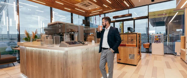 Заказ делается через терминал либо приложение, затем собирается на конвейерной ленте, и гости даже могут посмотреть, как ловкие роборуки ставят на поднос свежеприготовленную еду.
